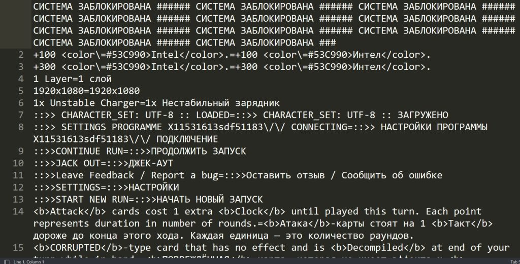 Дальше вы берете этот файлик и даёте чего ChatGPT или Гроку или что вы там юзаете, и просите перевести с контекстом, что это карточная игра в жанре киберпанк и вам надо перевод для авто-трнанслвейтера на Unity,, чтоб он теги не сжевал. Он поймет. Далее он переведет и вы просто обновляете этот файлик на то, что он вам даст.